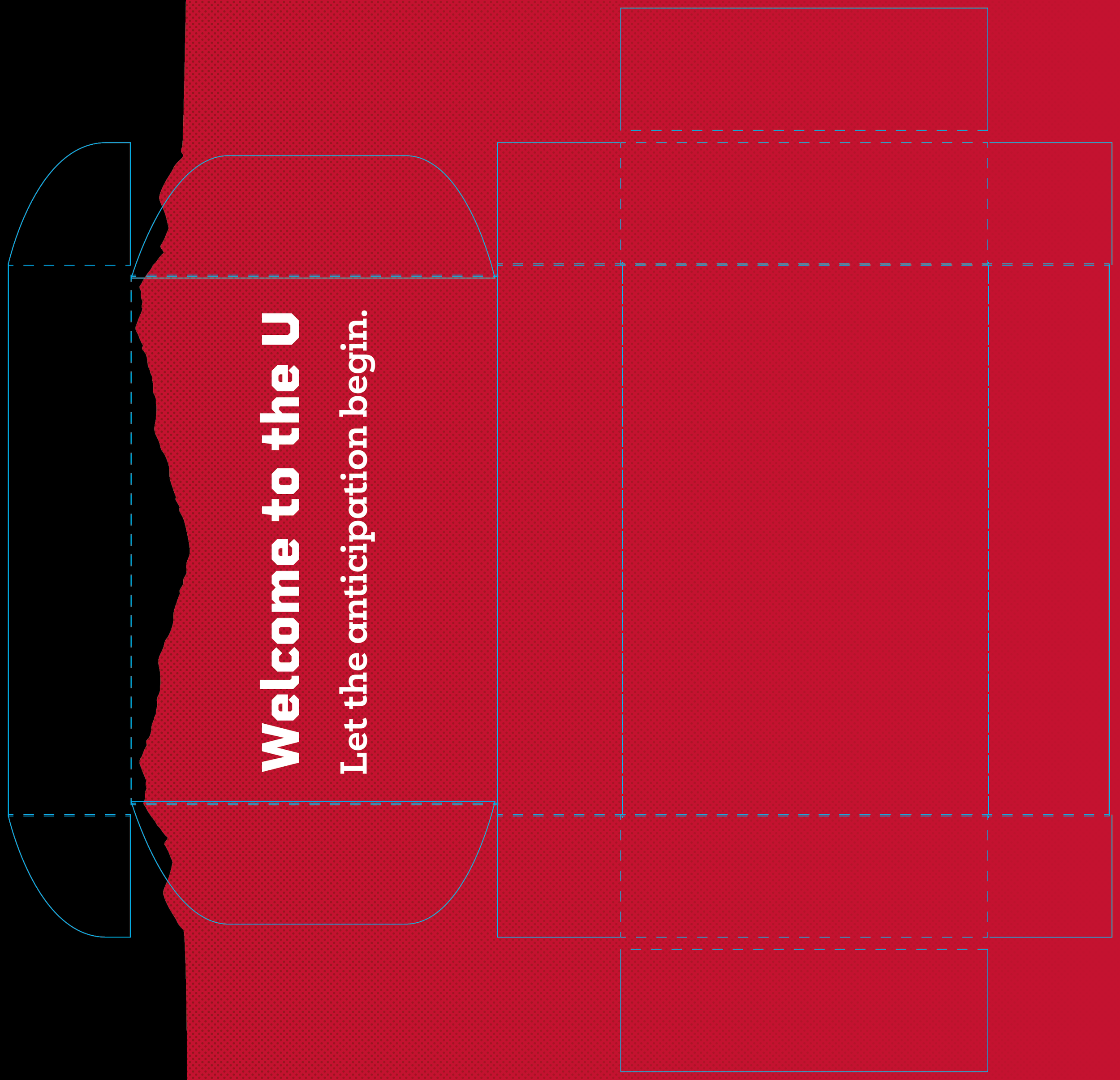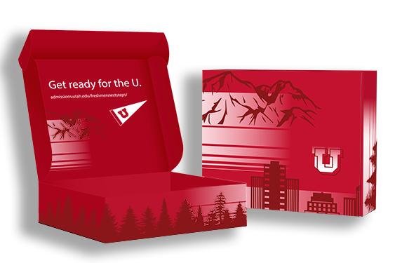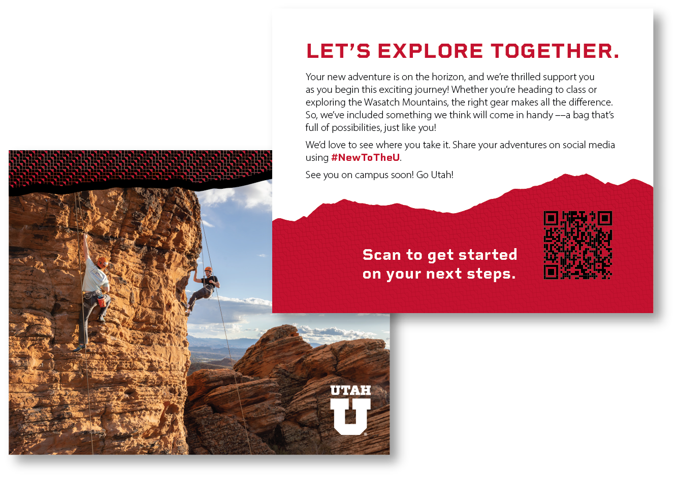 Bold typography and the signature Utah Red create a striking first impression, while textured, UV-printed text on the cover adds a tactile element of excitement. Consistent design elements, including mountain graphics and a vibrant photo of on the welcome card, help students imagine themselves as part of campus life. A branded cross bag and bold packaging round out the experience, giving students a red-carpet welcome before they even arrive.