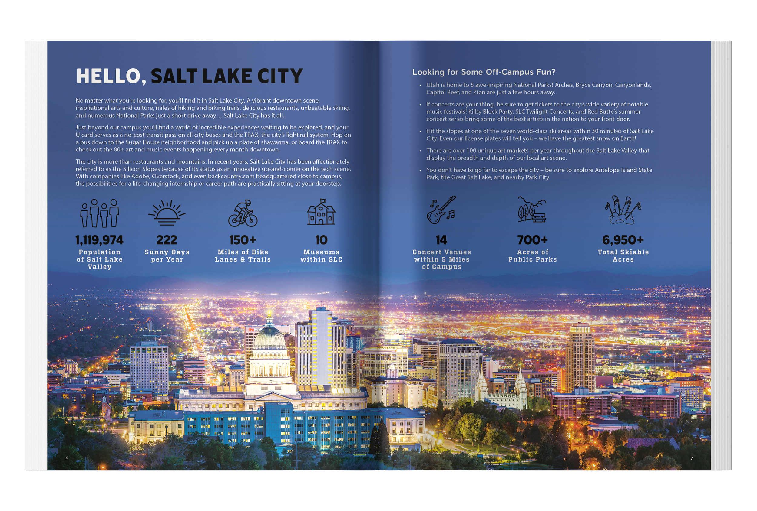 The Viewbook includes vibrant photography, compelling narratives, testimonials, and detailed descriptions of academic offerings and campus resources. Providing a glimpse into the University of Utah’s experience and encouraging prospective students to envision themselves as part of the campus community.