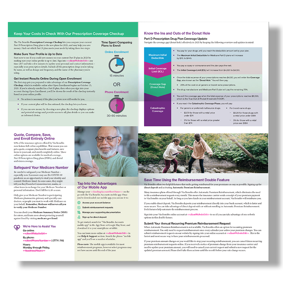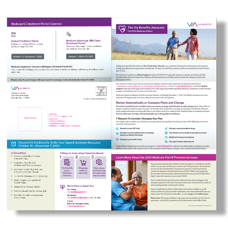 Newsletter communications are sent to participants to keep them up-to-date with information about Medicare and, when applicable, requirements to maintain their HRA. The Fall Newsletter is a condensed print piece to update participants on Medicare news and remind them about Open Enrollment dates. The Newsletter is a 9in by 16.5in self-mailer that is folded three times and tabbed with a finished size of 9in by 5.5in.