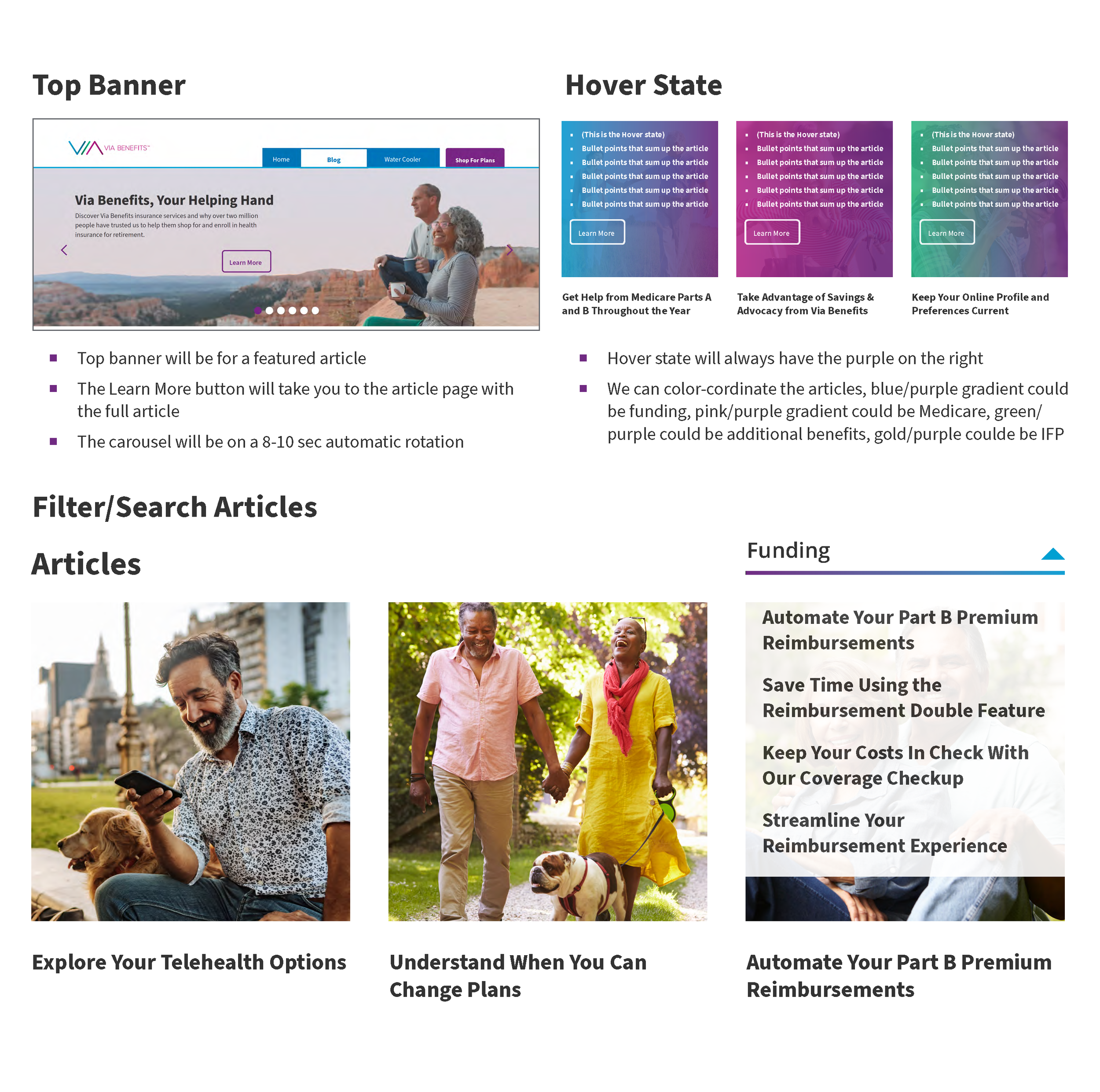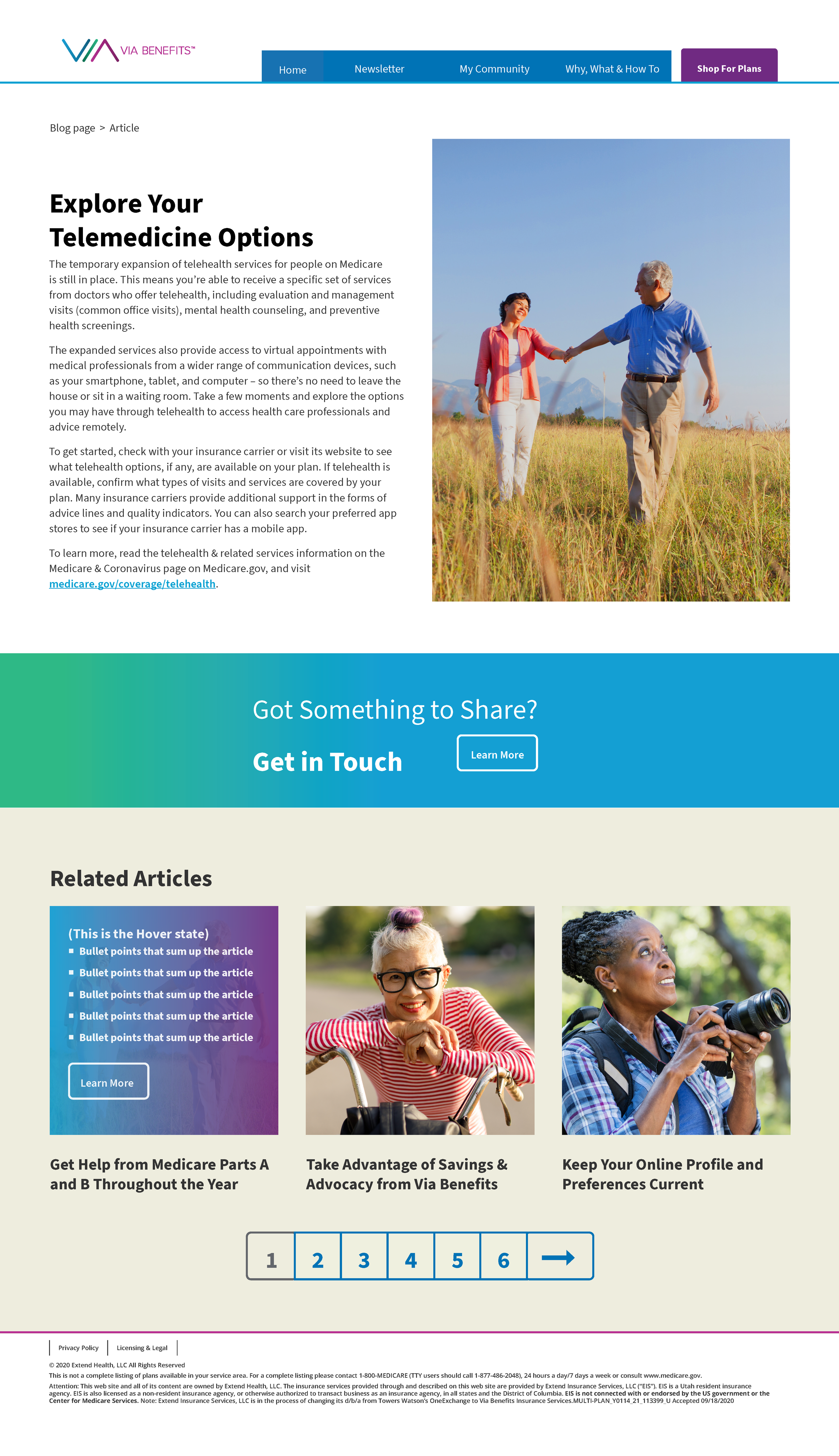 This project was one of the first in an attempt to help connect with a large participant population of the Via Benefits community. Targeting the Via Benefits populations age ranged 50-64 pre-retiree population, this site is a mix of an educational blog and a promotional site where the participants can connect with each other and the Via Benefits team.