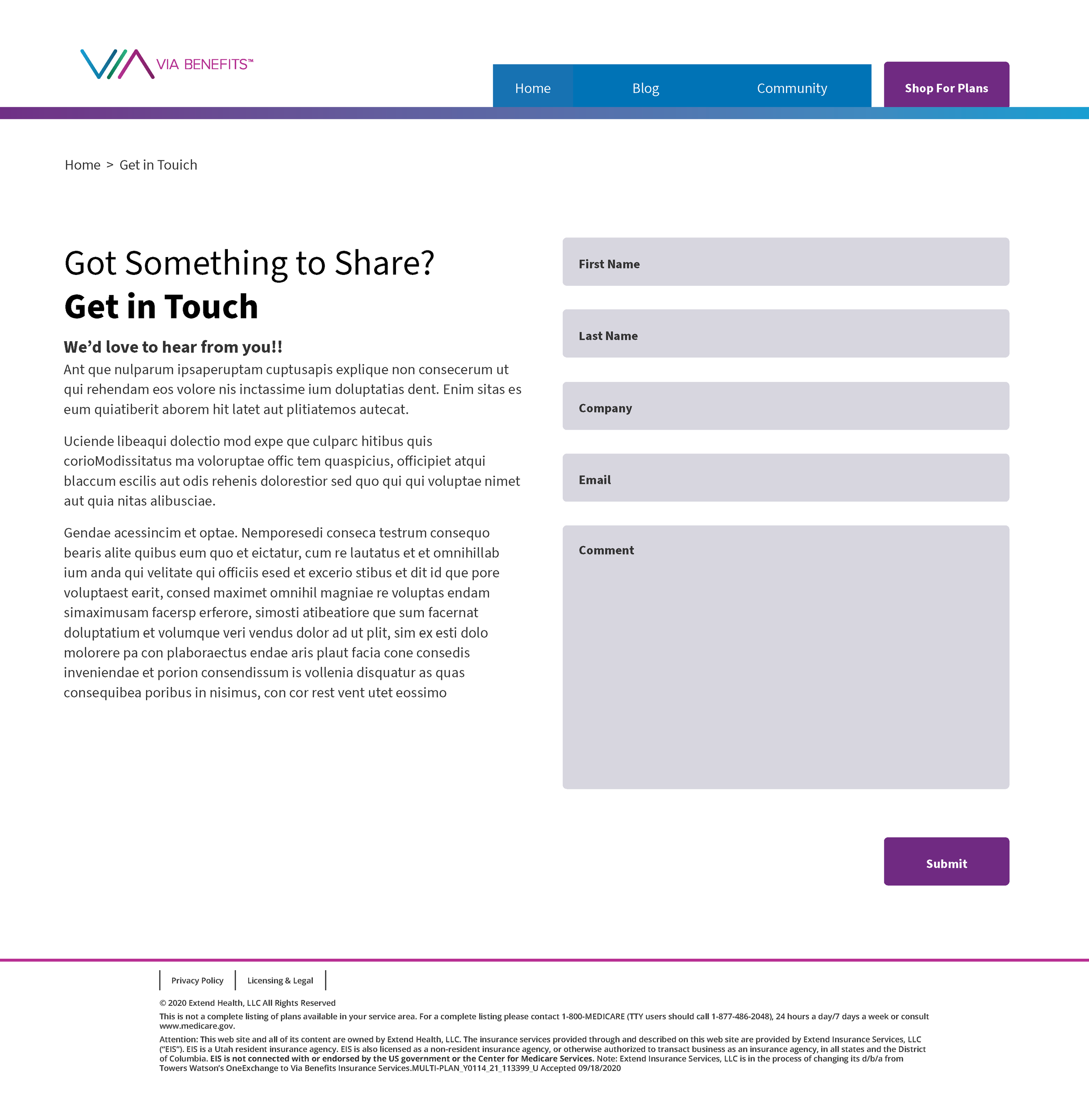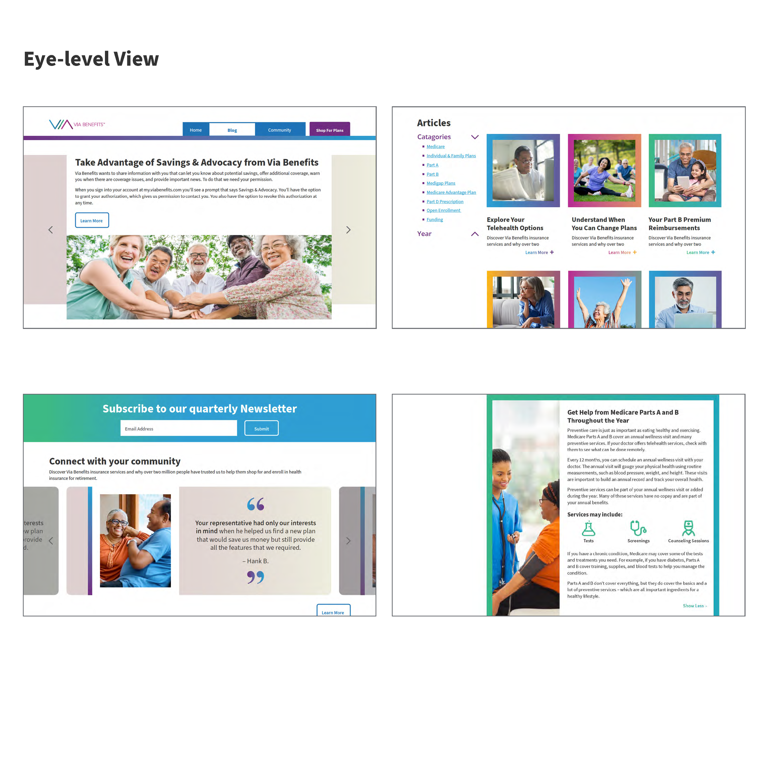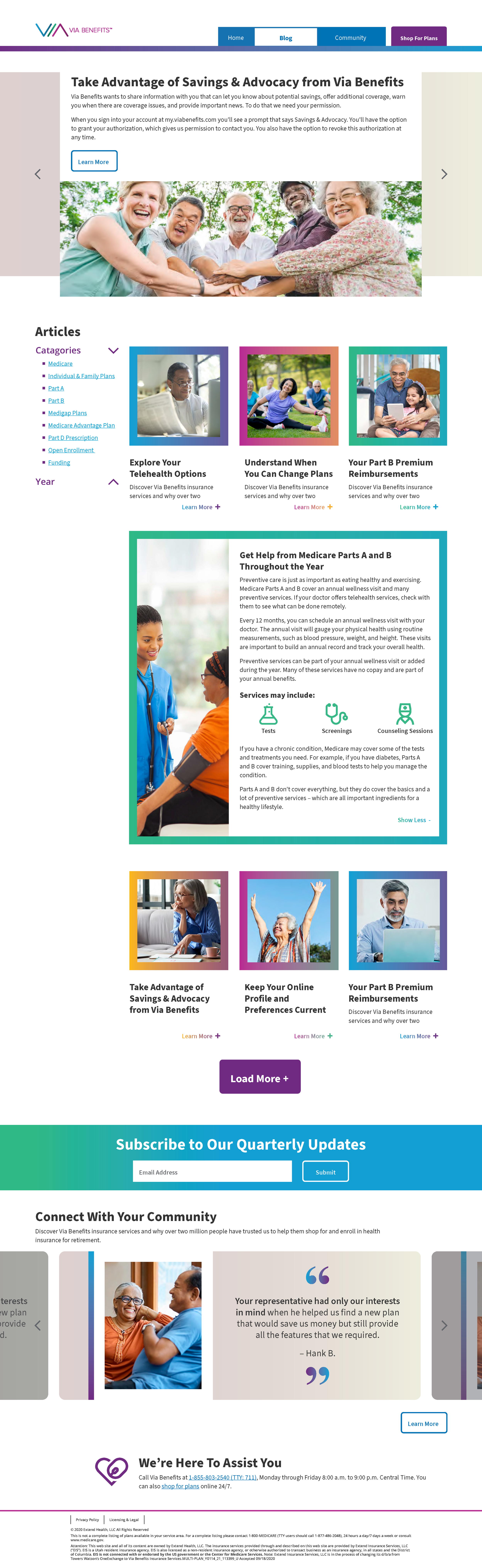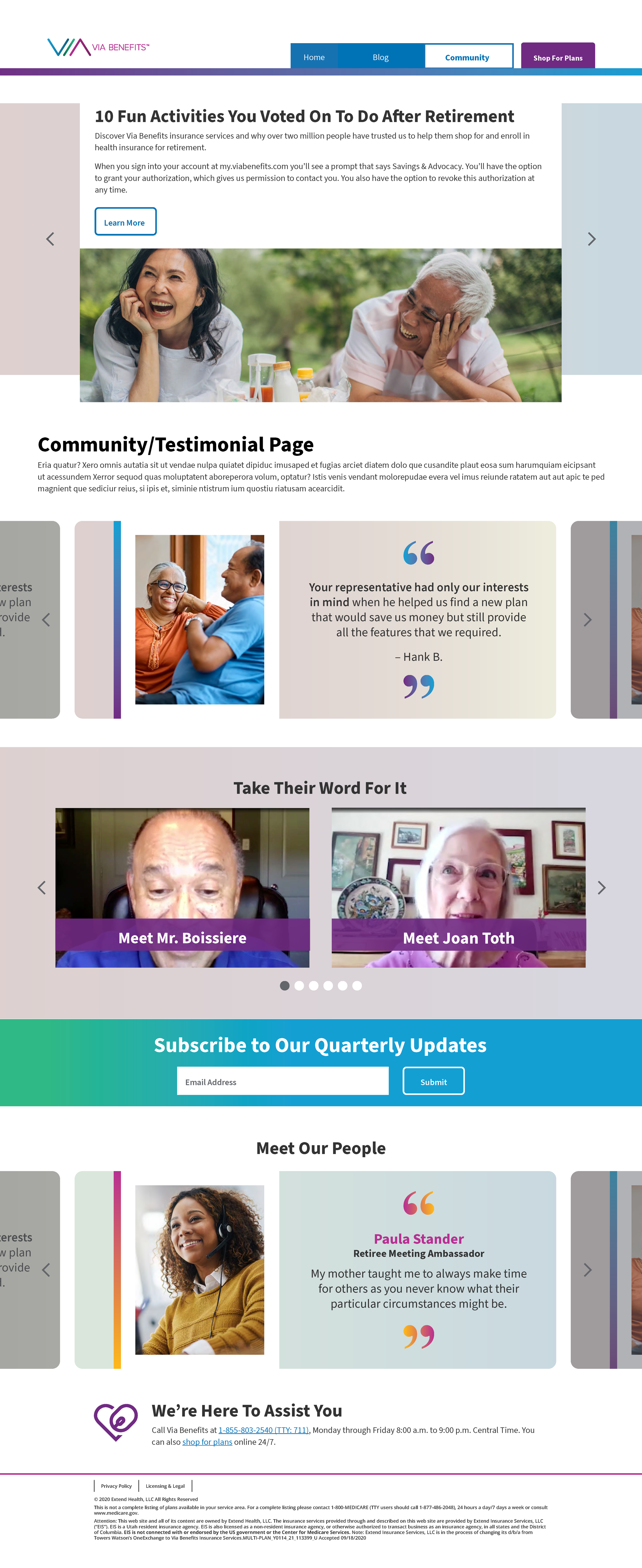 This project was one of the first in an attempt to help connect with a large participant population of the Via Benefits community. Targeting the Via Benefits populations age ranged 65-85 Medicare population, this site is a mix of an educational blog and a promotional site where the participants can connect with each other and the Via Benefits team.